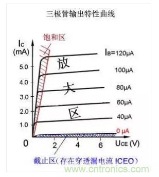 當(dāng)IB很大時,IC變得很大,不能繼續(xù)隨IB的增大而增大,三極管失去放大功能,表現(xiàn)為開關(guān)導(dǎo)通。