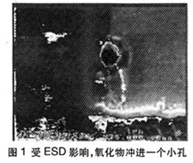 如圖1所示,電子部件受ESD影響時,會發(fā)生什么?會產(chǎn)生一個細微的孔,氧化物將侵?jǐn)_部件。