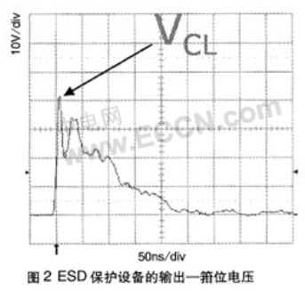 圖2所示的是一次ESD事件中,ESD保護設(shè)備的輸出(箝位電壓)。