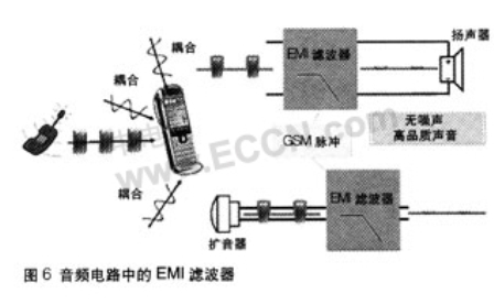 在音頻電路中如有電磁干擾(EMI),會出現(xiàn)嘶嘶、噼啪、嗡嗡等聲音,聲音質(zhì)量很差。手機用戶無法忍受這樣的干擾。因此,必須設(shè)法過濾音頻電路的電磁干擾。