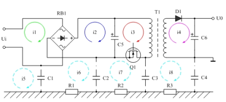 另外,還有4個回路電流i5、i6、i7、i8,這四個回路電流一般人是不會太注意的。這四個電流與前面的3個電流i1、i2、i3基本沒有直接聯(lián)系,它們都是通過電磁感應(yīng)(電場與磁場感應(yīng))產(chǎn)生的。在這幾個電流中,其中以i7最嚴(yán)重,因為,變壓器初級線圈產(chǎn)生的反電動勢一端正好通過C3與大地相連,另一端經(jīng)過其它3個回路與交流輸入回路相連。