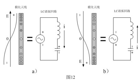 圖12是極化天線的工作原理圖,圖12-a)和圖12-b)表示天線在電場中被感應(yīng)產(chǎn)生極化的兩種不同情形。所謂極化就是導體或物體在電場力的作用下產(chǎn)生帶電,這種帶電是極化帶電,即:導體或物體的一端帶正電,而另一端帶負電。一般地說,導體或物體被極化帶電,只是兩端帶電,而中心點是不帶電的。由于,極化天線的電場是一個交變電場,所以,天線總是在圖12-a)和圖12-b)之間來回變化。12-a)和圖12-b)最左邊的圖形是表示電場方向和天線的電荷分布曲線,中間圖形表示載流子在極化天線中流動,右邊圖形表示天線的等效電路。