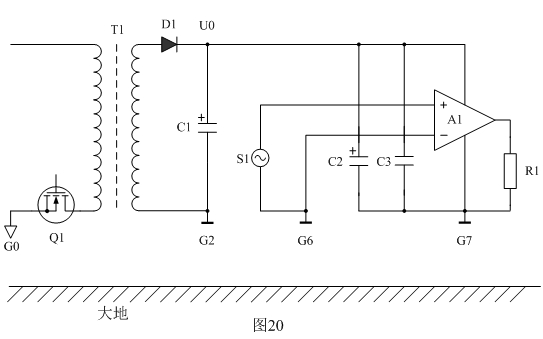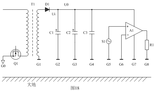 下面我們以圖18為例來分析地線對(duì)EMC產(chǎn)生的影響。圖18中Q1表示開關(guān)電源,T1為開關(guān)變壓器,D1為整流二極管,C1、C2、C3為濾波電容器,A1為功率放大器,S1為功率放大器輸入信號(hào),R1為功率放大器輸出負(fù)載,G1、G2、G3、G4、G5、G6、G7、G8為各個(gè)器件的地;Ui表示整流輸出電壓,Uo表示經(jīng)過濾波后的輸出電壓。