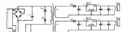 輸入為交流85~200V,經(jīng)功率二極管整流橋變?yōu)橹绷鳎鳛镈C/DC反激變換器的輸入,輸出為三組直流:5V、15V、20V,另外還有一輔助電源5V,用來給光耦NEC2501供電??刂齐娐窞榉答伩刂?,開關(guān)選用TOPSwitch電源芯片(TOP223)。TOPSwitch為三端離線式PWM電源集成控制器,它將PWM控制器與功率開關(guān)MOSFET合為一體,采用TO-220或8腳DIP封裝,除D、C2腳外,其余6腳連在一起作為S端。