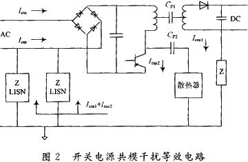 如圖2所示,當開關(guān)管轉(zhuǎn)為“關(guān)”時,集電極與發(fā)射極間的電壓快速上升達500V,他產(chǎn)生的電流經(jīng)集電極與地之間的分布電容返回整流橋,這個按開關(guān)頻率工作的脈沖串電流是共模噪聲。這個電壓會引起共模電流Icm2向CP2充電和共模電流Icm1向CP1充電,其中CP1為變壓器初、次級之間的分布電容,CP2為開關(guān)電源與散熱器之間的分布電容(即開關(guān)管集電極與地之間的分布電容)。則線路中共模電流總大小為Icm1+Icm2。