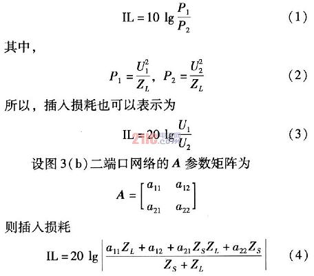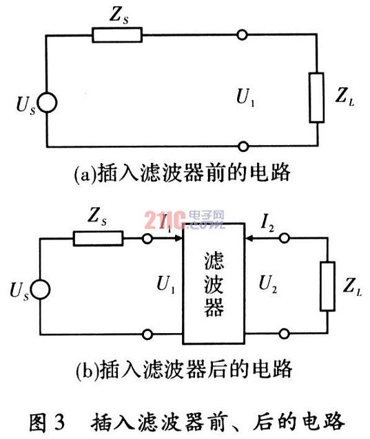 插入損耗是評價濾波器性能的主要指標(biāo),它是頻率的函數(shù)。插入損耗的定義為,沒有濾波器接入時,從噪聲源傳輸?shù)截撦d的功率P1和接入濾波器后噪聲源傳輸?shù)截撦d的功率P2之比,用dB表示。插入損耗越大,說明濾波器抑制干擾的能力越強。濾波器接入前后的電路圖,如圖3(a)和圖3(b)所示。濾波器的插入損耗由式(1)表示。