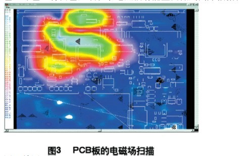 利用電磁輻射掃描儀,對裝聯(lián)并上電后的機(jī)盤掃描,得到PCB中電磁場分布圖(如圖3,圖中紅色、綠色、青白色區(qū)域表示電磁輻射能量由低到高),根據(jù)測試結(jié)果改進(jìn)PCB設(shè)計(jì)。