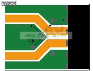 時鐘分布或合成器設備路由出來、用于承載相同頻率的跡線集群可能相鄰而行,因為干擾源音調(diào)已經(jīng)存在于接收器線路上。不過,分組的線路最終會分散。分散時,應在分散線路之間提供接地灌流,并在其開始分散的地方灌入通孔,以便感應回流沿著額定回流路徑流回。在圖3中,接地島末端的通孔可使感應電流流到參考層上。接地灌流上其它通孔之間的間隔不要超過一個波長的十分之一,以確保接地不會成為共振結(jié)構(gòu)。