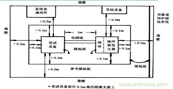 ① 試驗(yàn)應(yīng)在試驗(yàn)室中央進(jìn)行,除位于試品及試驗(yàn)儀器下方的參考接地板外,它們與其他所有導(dǎo)電性結(jié)構(gòu)(例如屏蔽室里的墻壁和實(shí)驗(yàn)室里的其他有金屬結(jié)構(gòu)的試驗(yàn)儀器和設(shè)備)之間的最小距離為0.5m,以避免脈沖群干擾中輻射成分的反射,再與原先的干擾疊加,對試驗(yàn)結(jié)果產(chǎn)生影響。