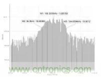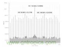 圖 6、圖 7 分別為對(duì)不加頻率抖動(dòng)和加了頻率抖動(dòng)進(jìn)行傅里葉分析的頻譜圖,對(duì)比圖 6 和圖 7 可以看出加了頻率抖動(dòng)電路之后在固定頻率處的頻譜幅值下降了大約11 dB,由此可見頻率抖動(dòng)電路對(duì)減小 EMI 的效果非常明顯。