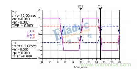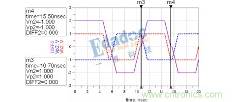可以看到,兩次經(jīng)過零軸的時(shí)間由之前的5ns變成了4.8ns?;蛘哒f,N與P的長度差,引起了0.04UI的抖動。這時(shí)候,串行的Clock recovery該花點(diǎn)心思才能將其時(shí)鐘解出來了。而且在進(jìn)行時(shí)鐘與數(shù)據(jù)對位的時(shí)候,是對在0V這個(gè)階梯的左邊還是對在右邊呢?這又會引起時(shí)序問題的出現(xiàn)。