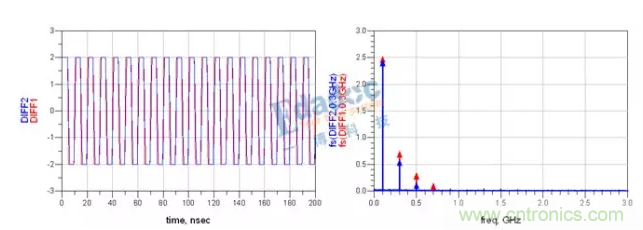 圖中,藍(lán)色的是N與P不等長的信號,可以看到,當(dāng)兩線不等長的時(shí)候,差分信號的能量明顯變?nèi)趿耍嵌嗟哪芰咳ツ睦锪四兀?/div>