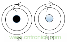 (2)當(dāng)有兩條彼此靠近且平行的導(dǎo)線,如下圖所示,其中一個(gè)導(dǎo)體的電流向外流出,另一個(gè)導(dǎo)體的電流向內(nèi)流入,如果流過(guò)這兩根導(dǎo)線的電流分別是信號(hào)電流和它的回流電流,那么這兩個(gè)電流是大小相等方向相反的,所以它們的磁場(chǎng)也是大小相等,而方向是相反的,因此能相互抵消。