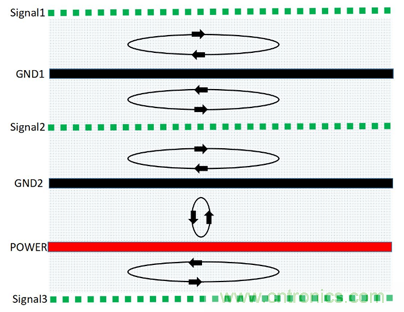 (2)降低EMI:鏡像層的存在減少了信號(hào)和回流形成的閉合環(huán)的面積,降低了EMI;