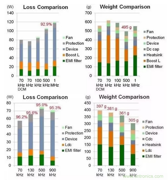 2、慎重選擇開關(guān)頻率,開關(guān)頻率會極大的影響整個變化器的功率密度,而且針對不同器件,拓撲,最佳的開關(guān)頻率是變化的。