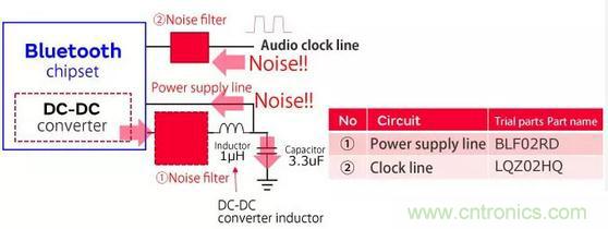 在這種情況下,我們引入了噪聲抑制的示例,其中同一電路中的噪聲干擾藍(lán)牙通信信號。該技術(shù)還可以應(yīng)用于以2.4 GHz頻率通信的非藍(lán)牙設(shè)備,我們已經(jīng)實(shí)現(xiàn)了噪聲抑制組件,這些組件在2.4 GHz的超小型x 0.4 mm x高頻范圍內(nèi)非常有效考慮到在添加組件時(shí)需要節(jié)省安裝表面積,需要0.2 mm。