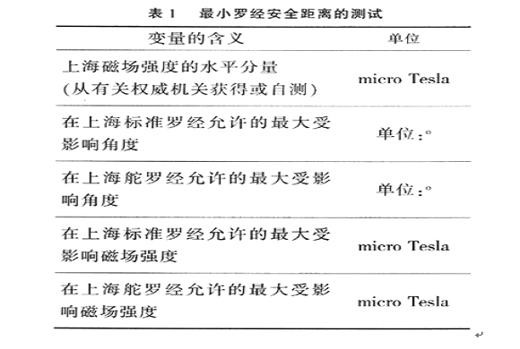 羅經(jīng)最小安全距離的測(cè)試方法是利用地球磁場(chǎng)強(qiáng)度與角度的關(guān)系,將對(duì)角度的測(cè)量轉(zhuǎn)化為對(duì)磁場(chǎng)強(qiáng)度的測(cè)最。在上海地區(qū)的測(cè)試方法如表1所示。