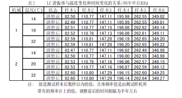 根據(jù)本文中所推出的原理試作了LC諧振頻率測試機(jī)分別對6個(gè)種類LC諧振體樣本(產(chǎn)品)進(jìn)行測試。本LC諧振測試機(jī)已應(yīng)用在6個(gè)種類LC諧振體的生產(chǎn)和產(chǎn)品檢驗(yàn)上。具體結(jié)果參照表1和表 2。