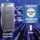 MAX3627具有七路LVDS輸出和一路LVCMOS輸出,MAX3629具有五路LVDS輸出和三路LVCMOS輸出。這兩款器件采用低噪聲晶體振蕩器和PLL架構(gòu),能夠從25MHz晶體或參考時鐘輸入產(chǎn)生超低抖動(0.14psRMS)的高頻(312.5MHz)時鐘信號。MAX3627/MAX3629可同時產(chǎn)生兩路頻率由引腳設定的時鐘信號,分別為以太網(wǎng)端口和MAC提供時鐘。該功能省去了昂貴的高頻振蕩器和扇出緩沖器,節(jié)省了電路板的空間和成本。