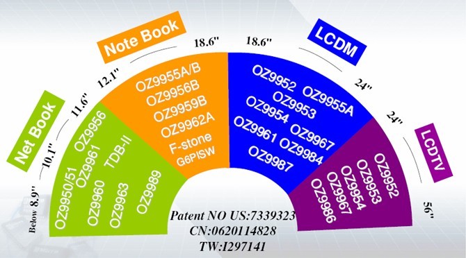 基于這樣的技術積累,目前凹凸科技已成為擁有最廣泛LCD背光驅動IC產(chǎn)品線的廠商,如圖1所示,從上網(wǎng)本到筆記本電腦再到LCD顯示器模塊、LCD TV,尺寸從8.9吋橫跨到56吋,凹凸科技能提供滿足各類應用需的相應LED驅動器解決方案(具備不同的效率等級、PWM接口、不同通道數(shù)),包括3x9、4x7、4x8、6x10、8x8、8x9等不同配置。多種技術特性如集成高速PWM功能、采用快速切換的開關模式、突波模式與相移技術,及其專有的區(qū)域照明等技術,則可幫助開發(fā)人員解決多串數(shù)LED均流、LED線性調(diào)光所產(chǎn)生的噪聲、功率耗散,以及廠商對于保護規(guī)格要求不一等挑戰(zhàn)。