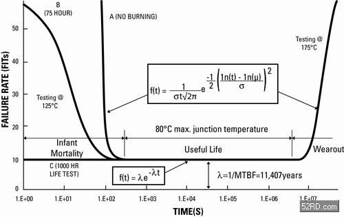 第1個(gè)區(qū)段描述了裝置的失敗率。只要在生產(chǎn)裝置中進(jìn)行若干測(cè)試,就可以把故障率降低到一個(gè)在實(shí)際運(yùn)行中可以接受的水平。第2個(gè)區(qū)段描述了實(shí)際工作壽命中有可能出現(xiàn)的隨機(jī)故障。它們與時(shí)間無關(guān),有關(guān)裝置也不會(huì)預(yù)先替換,一般都會(huì)在發(fā)生故障時(shí)才會(huì)被替換。第3個(gè)區(qū)段顯示了裝置的壽命接近終結(jié)而開始出現(xiàn)損耗。假如不加以替換,有一半產(chǎn)品都會(huì)在壽命中期開始失效。