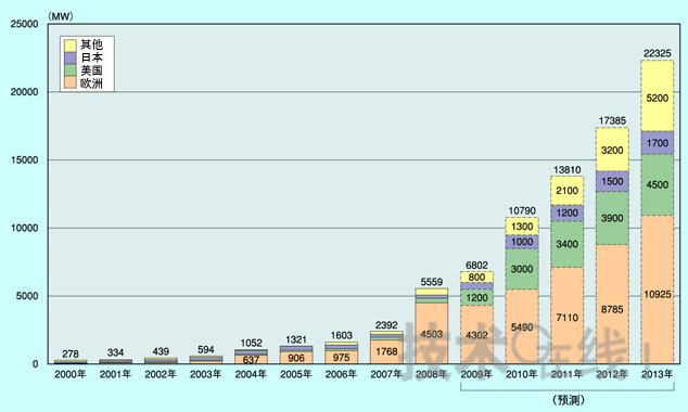 - 2013年歐洲市場的擴(kuò)大率將為2008年的2.4倍,達(dá)到1萬925MW