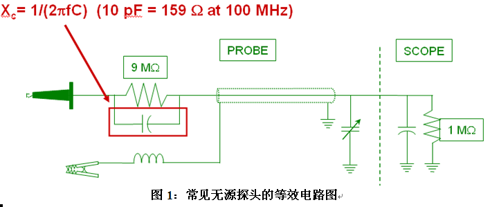 從無源探頭的原理來看,如圖1所示為常見的無源探頭的簡化電路圖,通常示波器標配的無源探頭的直流輸入電阻為10兆歐(探頭的9兆歐與示波器前端1兆歐串聯(lián)),輸入電容為10pf左右,與9兆歐電阻并聯(lián)。當待測試信號的頻率較高時,容抗隨著頻率升高而減小,所以無源探頭整體的輸入阻抗變小,當頻率為100MHz時,輸入阻抗為159歐。