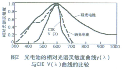 光電池的相對光譜靈敏度曲線與CIEV(λ)曲線的比較見圖2。