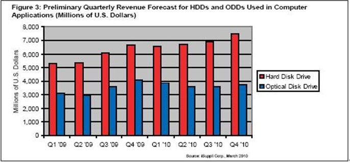 據(jù)iSuppli公司,繼2009年下滑之后,預(yù)計2010年用于電腦的硬盤(HDD)和光驅(qū)(ODD)全球營業(yè)收入將增長,因為PC出貨量將隨著全球經(jīng)濟(jì)復(fù)蘇而上升。