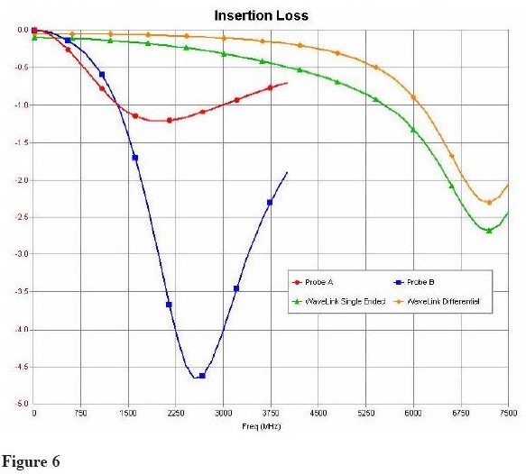 為了比較差分探頭的性能,通常在良好定義和常數(shù)電路中畫出負(fù)載效應(yīng)。比如,每個(gè)探頭在50歐姆理想環(huán)境中產(chǎn)生的插損如Figure 6所示。插損用dB表示;作為電壓表示,必須除以20,采用反對數(shù)。比如Probe B導(dǎo)致的4.6dB的插損會產(chǎn)生41%的幅度損失。這對于被探測的信號有顯著影響。