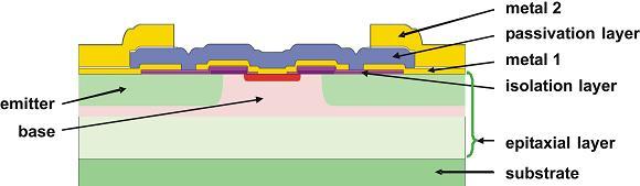 通過選擇不同的低電阻襯底,比如:圖1所示的摻磷/摻砷襯底,可以有效降低半導(dǎo)體中的電壓降比例。另一個重要的影響因素是電流分配,應(yīng)在整個芯片范圍內(nèi)盡可能保持均衡,將芯片前端金屬化擴展電阻降至最低。對于BISS晶體管,芯片中的均衡電流分配通過一種稱為網(wǎng)格技術(shù)的手段來實現(xiàn)——將晶體管分成不同的格柵結(jié)構(gòu)。第四代BISS晶體管采用受專利保護的雙層金屬化布局,能夠最大程度提升發(fā)射極線路金屬厚度,降低飽和電阻(參見圖2)。