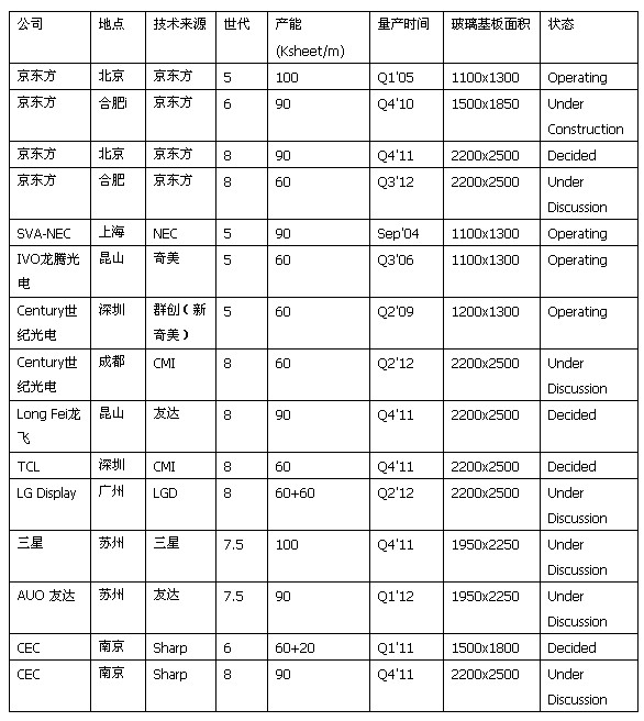 2004-2011年中國主要大尺寸TFT-LCD面板生產(chǎn)線一覽
