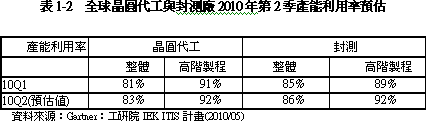 在IC制造業(yè)部分,預估2010Q2漸步入季節(jié)性需求上升期,配合產(chǎn)能逐步開出,臺灣IC制造業(yè)可望呈現(xiàn)價量齊揚的階段,帶動臺灣IC制造業(yè)產(chǎn)值上揚,預估可較2010Q1成長6.6%,并較去年同期成長47.6%