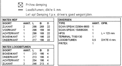 為了避免箱體共振,對(duì)兩側(cè)箱板和上、下面板使用22mm厚的中密度纖維板(MDF),前面板則使用30mm厚的MDF。6塊箱板的內(nèi)表面最好全部貼上4mm厚的鉛皮(但較貴),也可貼上相同厚度的瀝青油毛氈進(jìn)行聲阻尼。在箱板開口處應(yīng)仔細(xì)地將阻尼材料剪掉,以免妨礙驅(qū)動(dòng)單元和出聲管的安裝。
