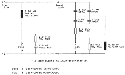 如果允許低音范圍的聲壓級(jí)低于100dB,則可使用一只口徑較小的低音單元。在這樣低的聲壓級(jí)下通常難以使低頻響應(yīng)下潛到50Hz以下,但本音箱使用的Scan-Speakl5cm低/中音單元在低頻下卻能產(chǎn)生足夠的聲輸出并能令人滿意地重放2kHz-3kHz的聲音,這樣就不必使用中音單元了。某些口徑較小的低音單元設(shè)計(jì)成能在較小的音箱中令人非常滿意的重放低音,本音箱使用的低/中音單元就是一個(gè)很好的例證。