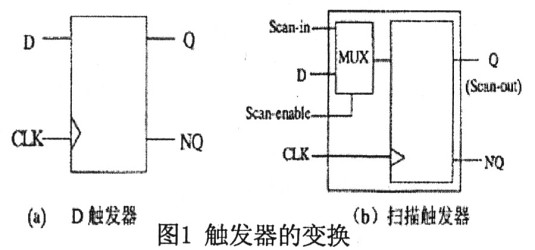 假設(shè)電路中的時(shí)序元件是由圖1(a)所示的D觸發(fā)器組成,寄存器變化法就是將此D觸發(fā)器轉(zhuǎn)化成圖1(b)所示的具有掃描功能的觸發(fā)器。從圖中可以看出掃描觸發(fā)器主要是在原觸發(fā)器的D輸入端增加了一個(gè)多路選擇器,通過(guò)掃描控制信號(hào)(Scan—enable)來(lái)選擇觸發(fā)器的輸入數(shù)據(jù)是正常工作時(shí)的輸入信號(hào)(D)還是測(cè)試掃描數(shù)據(jù)(Scan—in)。