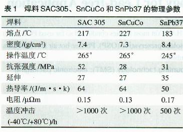 無鉛化合金熱風(fēng)整平工藝技術(shù)可分為兩大類:SnAgCu合金和SnCu合金。盡管說SnCu基合金與SnPb37的熔化點(diǎn)之間有固定的差異(44℃),但當(dāng)這兩大類合金在用于裝配和熱風(fēng)整平處理的時(shí)候,工藝操作溫度的實(shí)際差異在10℃~20℃之間。在采用熱風(fēng)整平工藝、波峰焊接和SMT。焊接設(shè)備進(jìn)行操作時(shí),SnPb合金通常在250℃~260℃的溫度范圍內(nèi)進(jìn)行操作,而SnCuCo合金的工藝操作溫度在260℃一270℃的范圍內(nèi),SAC305合金在255℃.265℃的溫度范圍內(nèi)。表l詳細(xì)列舉了一些無鉛化焊料和SnPb合金的物理參數(shù)。