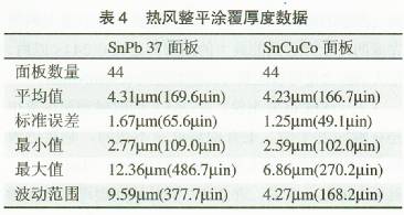 正如前文所談及的那樣,在實(shí)施PCB組件制造的時(shí)候,所采用熱風(fēng)整平工藝的比例從高達(dá)所有電路板中的80%減少到大約60%。隨著要求具有平坦一致的表面(共平面)的SMT技術(shù)穩(wěn)步發(fā)展,這種減少現(xiàn)象還會(huì)同步的發(fā)生。傳統(tǒng)的SnPb熱風(fēng)整平工藝能夠提供具有令人滿意共面性的SMT電路板?,F(xiàn)在關(guān)注的是無鉛化中熱風(fēng)整平會(huì)產(chǎn)生什么問題,經(jīng)無鉛化熱風(fēng)整平的電路板會(huì)更好還是更壞,或者與經(jīng)SnPb熱風(fēng)整平工藝處理的PCB組件是否具有相同的共平面效果?美國MetallicRe—sourcesInc公司的技術(shù)人員為此開始了一次又一次的試驗(yàn),結(jié)果表明SnCuCo比起傳統(tǒng)的SnPb共熔合金,會(huì)產(chǎn)生略簿一些、更趨共平面效果的涂覆。這些結(jié)果被反復(fù)地的進(jìn)行研究。表4顯示了從一臺(tái)水平放置的熱風(fēng)整平設(shè)備上實(shí)施這些試驗(yàn)的一些測試結(jié)果。