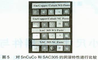圖4顯示了SnCuCo合會(huì)的潤濕特性。它與存采用了各種涂覆方式的電路板上的SAC305具有非常相似的效果。這也就說明SnCuCo至少與SAC305一樣,在電路板潤濕方面具有相同的性能。