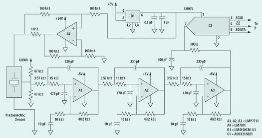 ADC121S021是一款設(shè)有串行外圍接口(SPI)的12位、200kSPS單端輸入轉(zhuǎn)換器。型號為LM4140ACM-4.1的另一款高精度電壓參考電路可為這款模擬/數(shù)字轉(zhuǎn)換器提供電壓參考,并為濾波放大器提供偏壓,并設(shè)置濾波器的偏置電壓為模擬/數(shù)字轉(zhuǎn)換器輸入電壓范圍的一半。傳感器的輸出屬于交流電信號,而中度的電平偏移可將信號轉(zhuǎn)移到模擬/數(shù)字轉(zhuǎn)換器輸入電壓范圍內(nèi)的中央位置。LM4140芯片也可為LM730132V通用放大器(即A4放大器)所輸出的壓控電流提供電壓參考。傳感器內(nèi)置的MOSFET可為壓電傳感電路提供緩沖。A4放大器負(fù)責(zé)輸出電流,以便驅(qū)動(dòng)組成為共源級放大器的MOSFET,而有關(guān)晶體管則通過交流耦合與輸出終端裝置連接在一起。