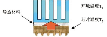 如圖1所示,目前比較常用的一種散熱方式是使用散熱器,用導(dǎo)熱材料和工具將散熱器安裝于芯片上面,從而將芯片產(chǎn)生的熱量迅速排除。本文介紹了根據(jù)散熱器規(guī)格、芯片功率、環(huán)境溫度等數(shù)據(jù),通過熱傳導(dǎo)計(jì)算來求得芯片工作溫度的方法。