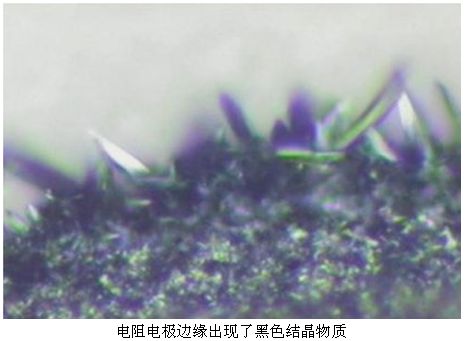 有一批現(xiàn)場儀表在某化工廠使用一年后,儀表紛紛出現(xiàn)故障。經(jīng)分析發(fā)現(xiàn)儀表中使用的厚膜貼片電阻阻值變大,甚至變成開路了。把失效的電阻放到顯微鏡下觀察,可以發(fā)現(xiàn)電阻電極邊緣出現(xiàn)了黑色結(jié)晶物質(zhì),進(jìn)一步分析成分發(fā)現(xiàn),黑色物質(zhì)是硫化銀晶體。原來電阻被來自空氣中的硫給腐蝕了!