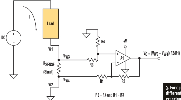 為避免引入這樣的誤差,需要進一步增加兩個措施:采用開爾文連接方式與分流電阻相連并加入一個差分輸入放大器。開爾文連接是一種帶有兩條激勵引線和兩條傳感引線的4線連接(圖2)。其中兩條線(W1和W2)是激勵引線,它們將分流電阻連接到該電路的大電流端。另外兩條線(W3和W4)為傳感引線,它們將分流電阻兩端的電壓連接到放大器。這個方式將攜帶負載電流的導線與測量電路分離開來,并把W1和W2中的電壓降從分流電阻兩端的電壓測量中清除。為了進一步有效利用開爾文連接的優(yōu)點,還需加入一個差分放大器(如圖3)。