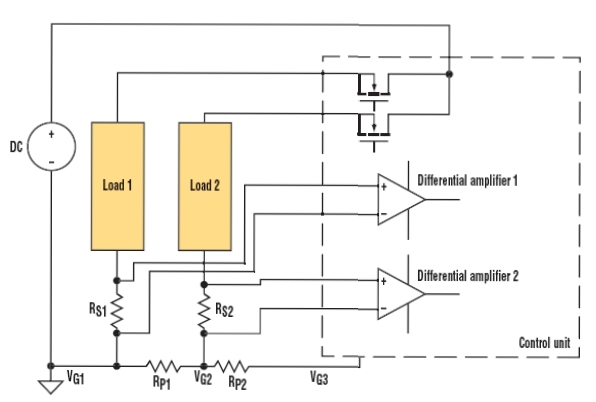 由于低端測量例子可能產(chǎn)生共模問題,這里考慮圖4所示的分布負載系統(tǒng)。虛線框中的控制單元使用MOSFET來控制輸送到兩個負載的功率。電源、負載和控制單元之間的寄生電阻RP1和RP2代表接地引線電阻和連接器電阻之和。在實際電路中,它們的數(shù)值可能為幾百毫歐。對于這個例子,假設RP1和RP2為0.2 Ω。差分放大器1和2與圖3中的差分放大器類似。