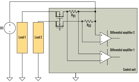 與圖1中一樣,流過每個負載的電流均為10A,分流電阻RS1和RS2均為0.025 Ω。流過控制單元的電流為1A。當負載2運行時,在點VG2點的電壓比VG1點的電壓高2V (0.2 Ωx10 A = 2 V),VG3比VG2高0.2V。因而,相對于在該控制單元的共同連接點,差動放大器1的輸入電壓為-2.2V,高于大多數(shù)放大器的負共模電壓極限。除非該差分放大器所使用的放大器針對負共模電壓而進行了特殊的設計,否則,該放大器在這個電路中將無法正常工作。對于本例而言,低端傳感還有一個缺點是需要用導線將分流電阻和差動放大器輸入連接起來。