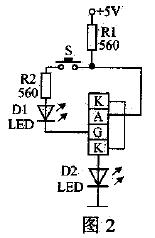 可控硅檢測(cè)電路如圖2所示,先用萬用表檢測(cè)出被測(cè)可控硅的A、G、K極,再將被測(cè)可控硅的A、G、K三個(gè)引腳插入對(duì)應(yīng)的插孔中,接通電源,不按按鈕開關(guān)S時(shí),發(fā)光二極管D2不發(fā)光,按一下按鈕開關(guān)S時(shí),若發(fā)光二極管D2能持續(xù)發(fā)光,則被測(cè)可控硅是好的。