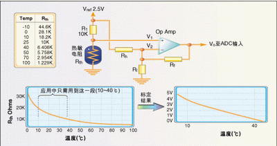 有時需要對熱敏電阻的輸入進(jìn)行標(biāo)定以便得到合適的溫度分辨率,圖3是一個將10~40℃溫度范圍擴(kuò)展到ADC整個0~5V輸入?yún)^(qū)間的電路。運算放大器輸出公式如下: