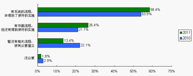 供求雙方把伙伴關(guān)系建立在專業(yè)評估的基礎(chǔ)上,通過系統(tǒng)流程可以有效減少供應商認證和引入過程中的不合理操作、暗箱操作、防范采購風險、提高采購效率。在供應商認證與引入過程中,沒有建立和認為沒必要建立系統(tǒng)流程的受訪者比例由2010調(diào)查的25%(22.1%+2.9%)降至2011調(diào)查的15.2%(13.4%+1.8%),已經(jīng)建立流程并且得到很好實施的比例也由2010調(diào)查的53.9%上升至2011調(diào)查的58.4%。