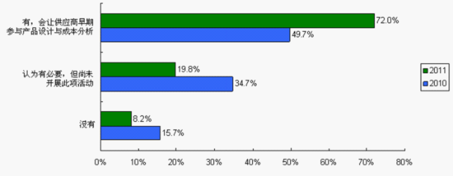 讓供應商參與早期的產(chǎn)品設(shè)計是增進供求雙方伙伴關(guān)系的途徑之一,借助供應商的技術(shù)優(yōu)勢,挖掘元器件成本空間,從而提高產(chǎn)品競爭力、加快產(chǎn)品上市、降低成本。讓供應商早期參與產(chǎn)品設(shè)計與成本分析由2010調(diào)查的49.7%大幅上升至2011調(diào)查的72%,而其中69.2%是主芯片供應商的參與,30.8%是被動元件供應商的參與。