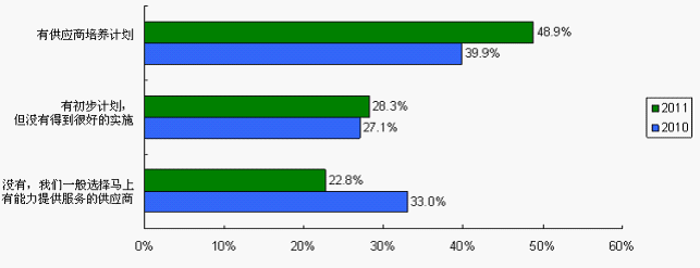培養(yǎng)供應商有利于建立供求雙方的伙伴關(guān)系,提高供應商忠誠度,增強采購風險抵御能力。有供應商培養(yǎng)計劃的系統(tǒng)廠商由2010調(diào)查的39.9%上升至2011調(diào)查的48.9%,而沒有計劃的由2010調(diào)查的33%降至22.8%。
